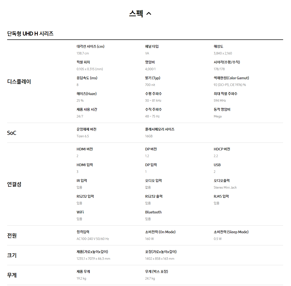 삼성 단독형 UHD H 시리즈 디스플레이는 업계 최고 수준의 UHD 해상도와 최대 700 니트의 밝기를 표현해 콘텐츠를 돋보이게 합니다.